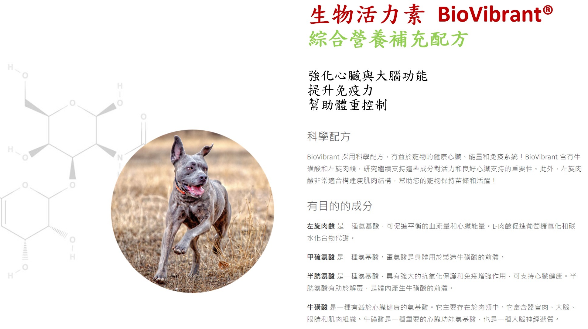 固麗寶BioVibrant ® 生物活力營養素 是一種多功能、完整的補充劑,旨在支持心臟、大腦和免疫系統所需的營養,並促進狗和貓的肌肉發育,幫助維持良好體態與活力!臨床研究繼續表明牛磺酸和左旋肉鹼作為狗/貓體內幾乎每個細胞的關鍵成分的重要性。