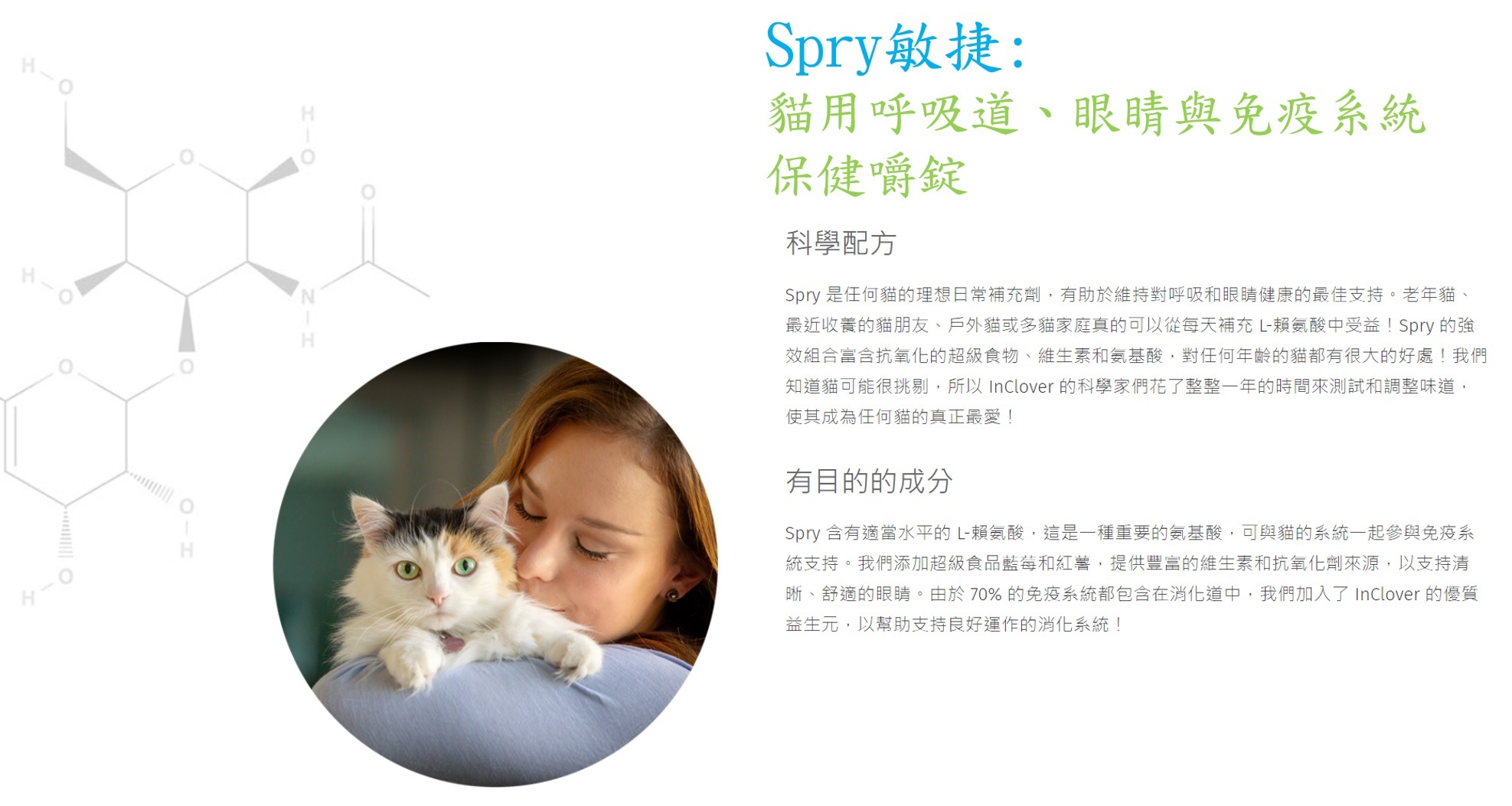 固麗寶Spry敏捷® 是根據動物臨床實證配製的科學配方,富含L-Lysine (L-賴氨酸/L-離胺酸)和天然抗氧化超級食物成分,以支持您的愛貓的呼吸系統和眼部保養需求!另外還添加固麗寶旗艦級的專利益生元成分,可偕同強化免疫力 ,適合經常流淚、打噴嚏的貓咪日常呼吸道保健。