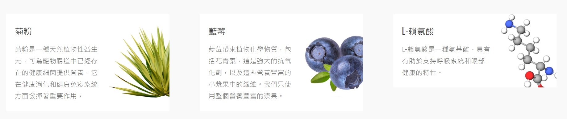 成分 : L-離胺酸(L-賴氨酸)、椰子甘油、鷹嘴豆粉、木薯澱粉、天然雞肝風味劑、向日葵卵磷脂、天然香料、阿拉伯樹膠、雞脂肪、藍莓纖維、紅薯、菜籽油、有機菊粉、菊苣根、瓜爾豆膠、天然奶油香料、緩衝白蒸餾醋、檸檬酸(天然防腐劑)、迷迭香提取物、葵花籽油、維生素E